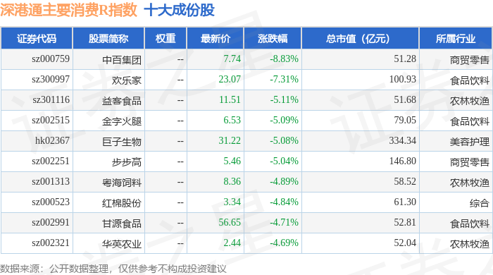 深港通主要消费R(483021)指数十大成份股详情如下: