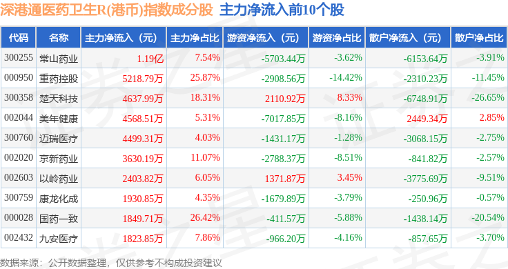 资金流向方面,深港通医药卫生R(港币)(483024)指数成份股当日主力资金净流出合计14.67亿元,游资资金净流出合计8902.55万元,散户资金净流入合计15.56亿元。成份股资金流向详情见下表: