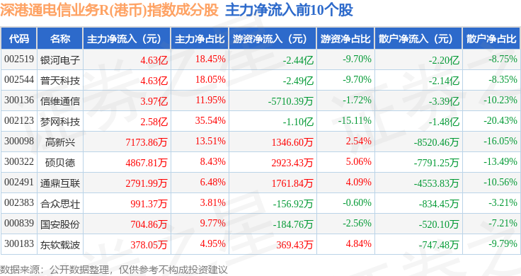 资金流向方面,深港通电信业务R(港币)(483030)指数成份股当日主力资金净流出合计117.09亿元,游资资金净流入合计41.98亿元,散户资金净流入合计75.11亿元。成份股资金流向详情见下表: