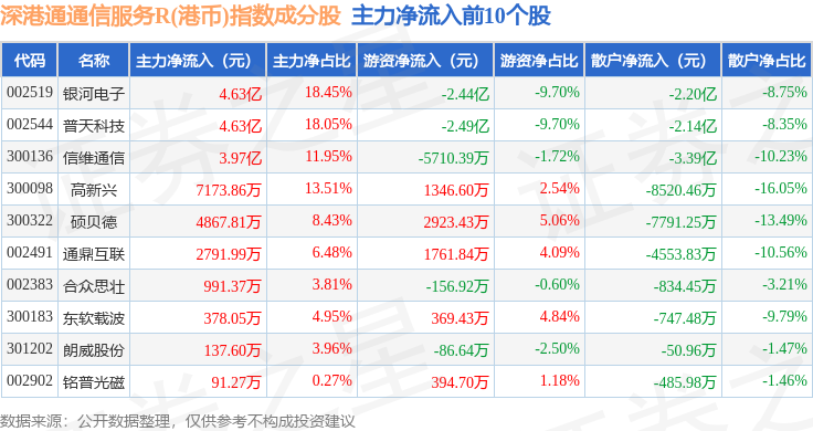 资金流向方面,深港通通信服务R(港币)(483034)指数成份股当日主力资金净流出合计117.04亿元,游资资金净流入合计42.64亿元,散户资金净流入合计74.4亿元。成份股资金流向详情见下表: