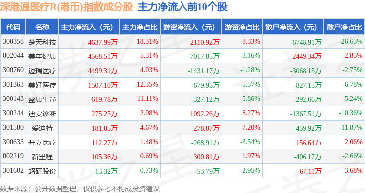 资金流向方面,深港通医疗R(港币)(483036)指数成份股当日主力资金净流出合计3.12亿元,游资资金净流出合计2687.77万元,散户资金净流入合计3.39亿元。成份股资金流向详情见下表:
