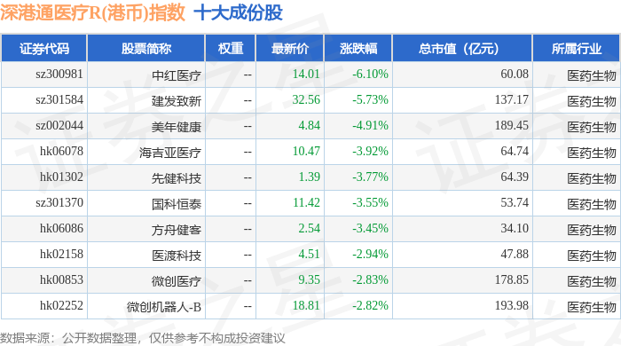 深港通医疗R(港币)(483036)指数十大成份股详情如下: