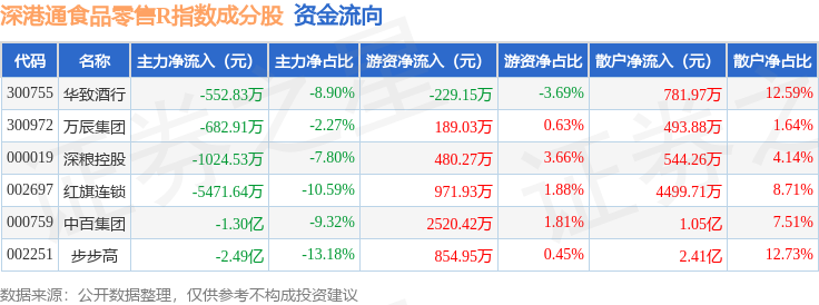 资金流向方面,深港通食品零售R(483037)指数成份股当日主力资金净流出合计4.56亿元,游资资金净流入合计4787.44万元,散户资金净流入合计4.08亿元。成份股资金流向详情见下表: