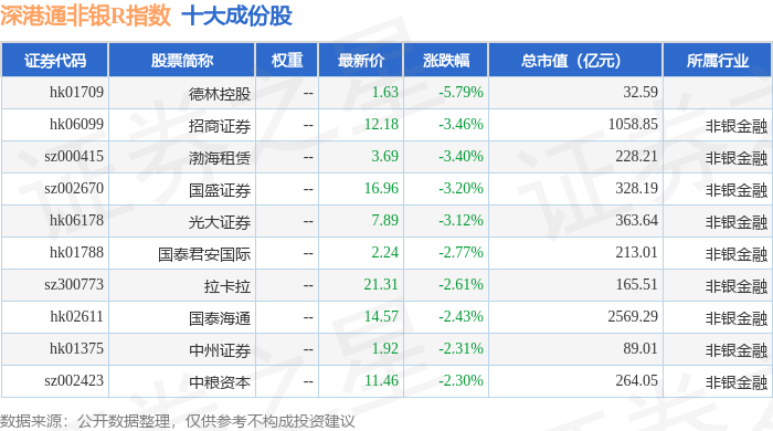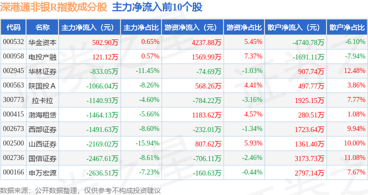 资金流向方面,深港通非银R(483053)指数成份股当日主力资金净流出合计14.22亿元,游资资金净流入合计4.24亿元,散户资金净流入合计9.98亿元。成份股资金流向详情见下表: