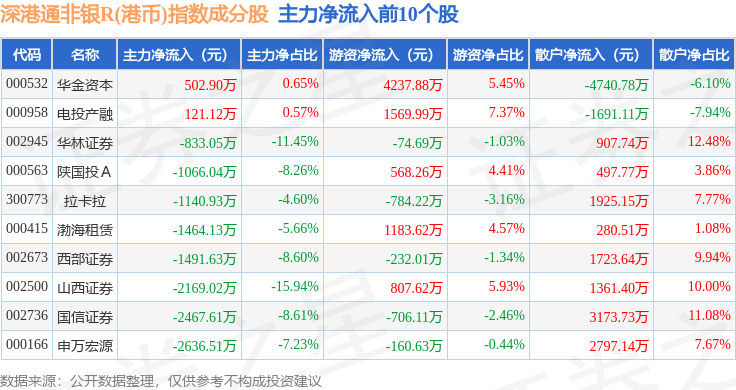 资金流向方面,深港通非银R(港币)(483054)指数成份股当日主力资金净流出合计14.22亿元,游资资金净流入合计4.24亿元,散户资金净流入合计9.98亿元。成份股资金流向详情见下表:
