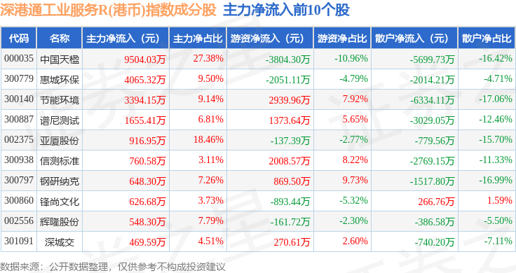 资金流向方面,深港通工业服务R(港币)(483056)指数成份股当日主力资金净流出合计18.33亿元,游资资金净流入合计4.39亿元,散户资金净流入合计13.94亿元。成份股资金流向详情见下表: