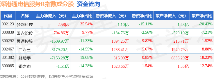 资金流向方面,深港通电信服务R(483057)指数成份股当日主力资金净流出合计486.65万元,游资资金净流出合计6592.02万元,散户资金净流入合计7078.68万元。成份股资金流向详情见下表: