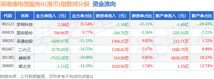 资金流向方面,深港通电信服务R(港币)(483058)指数成份股当日主力资金净流出合计486.65万元,游资资金净流出合计6592.02万元,散户资金净流入合计7078.68万元。成份股资金流向详情见下表: