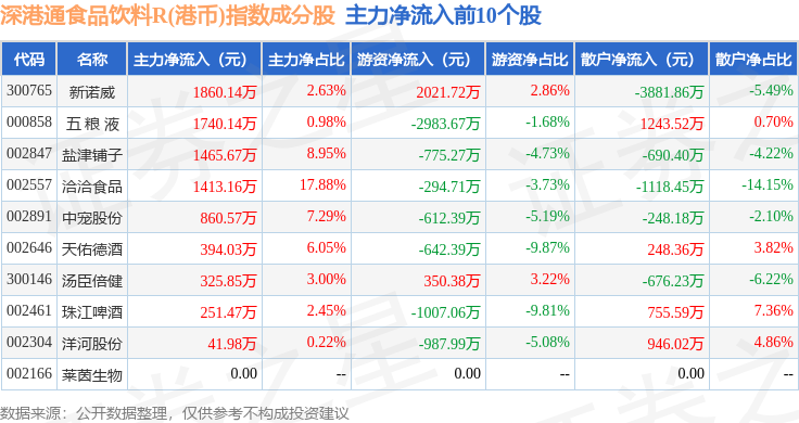 资金流向方面,深港通食品饮料R(港币)(483066)指数成份股当日主力资金净流出合计5.08亿元,游资资金净流入合计31.57万元,散户资金净流入合计5.08亿元。成份股资金流向详情见下表: