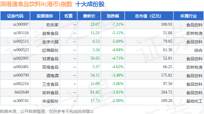 深港通食品饮料R(港币)(483066)指数十大成份股详情如下: