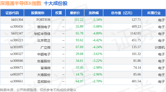 证券之星消息,12月11日,深港通半导体R(483067)指数报收于14574.9点,跌2.14%,成交401.38亿元,换手率3.1%。当日该指数成份股中,上涨的有4家,珂玛科技以10.44%的涨幅领涨,下跌的有35家,FORTIOR以5.34%的跌幅领跌。