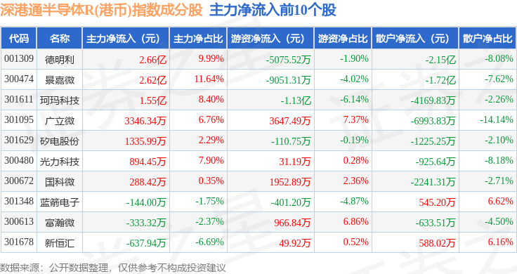 资金流向方面,深港通半导体R(港币)(483068)指数成份股当日主力资金净流出合计14.95亿元,游资资金净流入合计3.77亿元,散户资金净流入合计11.18亿元。成份股资金流向详情见下表: