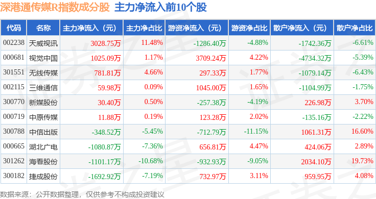 资金流向方面,深港通传媒R(483075)指数成份股当日主力资金净流出合计26.19亿元,游资资金净流入合计1.69亿元,散户资金净流入合计24.5亿元。成份股资金流向详情见下表:
