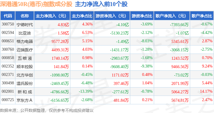 资金流向方面,深港通50R(港币)(483092)指数成份股当日主力资金净流出合计62.64亿元,游资资金净流入合计33.73亿元,散户资金净流入合计28.91亿元。成份股资金流向详情见下表: