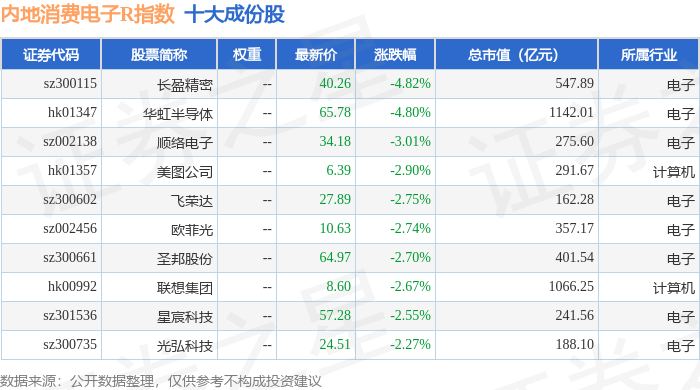 资金流向方面,内地消费电子R(483105)指数成份股当日主力资金净流出合计12.68亿元,游资资金净流入合计1.71亿元,散户资金净流入合计10.96亿元。成份股资金流向详情见下表: