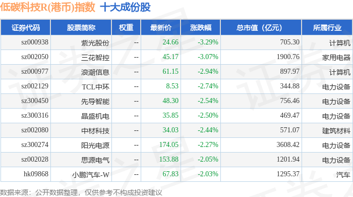 低碳科技R(港币)(483161)指数十大成份股详情如下: