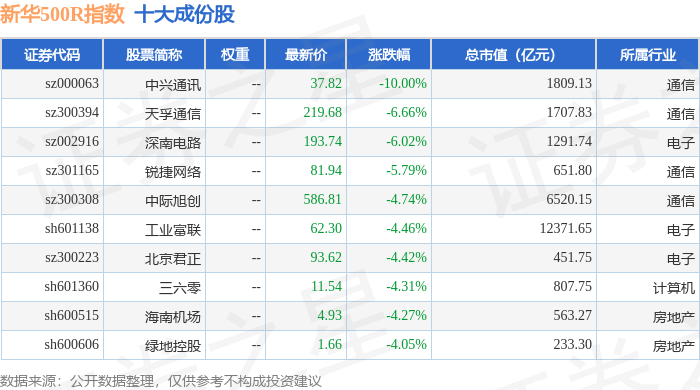 证券之星消息,12月11日,新华500R(489001)指数报收于7403.44点,跌0.83%,成交5917.84亿元,换手率0.66%。当日该指数成份股中,上涨的有105家,迈为股份以12.82%的涨幅领涨,下跌的有384家,中兴通讯以10.0%的跌幅领跌。