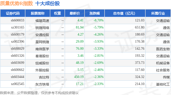 资金流向方面,质量优势R(489017)指数成份股当日主力资金净流出合计12.31亿元,游资资金净流入合计3.82亿元,散户资金净流入合计8.49亿元。成份股资金流向详情见下表: