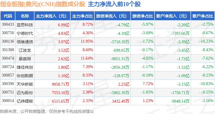 资金流向方面,创业板指(美元)(CNH)(970007)指数成份股当日主力资金净流出合计93.37亿元,游资资金净流入合计44.54亿元,散户资金净流入合计48.84亿元。成份股资金流向详情见下表: