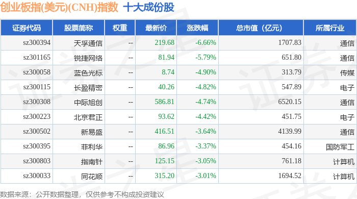 创业板指(美元)(CNH)(970007)指数十大成份股详情如下: