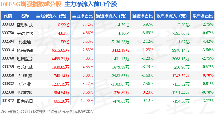资金流向方面,100ESG增强(970033)指数成份股当日主力资金净流出合计78.63亿元,游资资金净流入合计36.53亿元,散户资金净流入合计42.1亿元。成份股资金流向详情见下表: