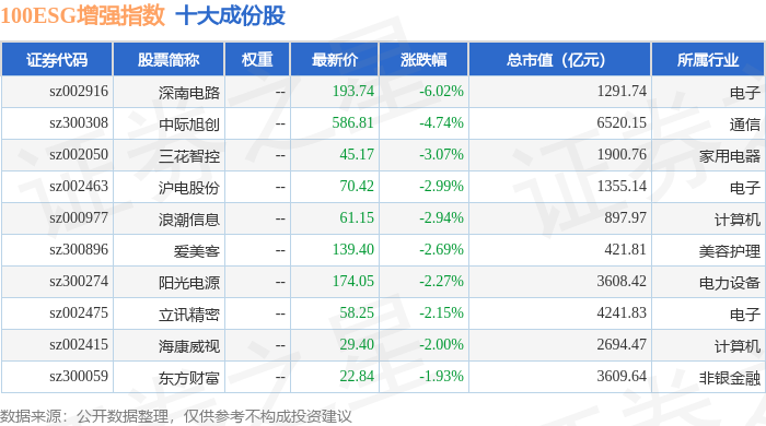 近10日内100ESG增强(970033)指数成份股做了调整,新纳入了6只股票,剔除了6只股票。