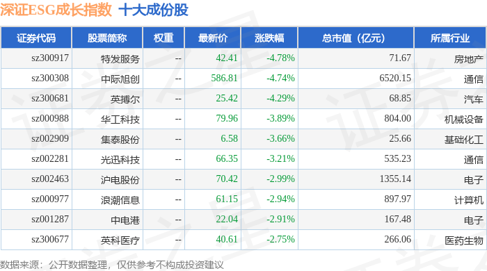 证券之星消息,12月11日,深证ESG成长(970060)指数报收于2277.27点,跌2.33%,成交949.42亿元,换手率1.62%。当日该指数成份股中,上涨的有11家,山金国际以6.06%的涨幅领涨,下跌的有39家,特发服务以4.78%的跌幅领跌。