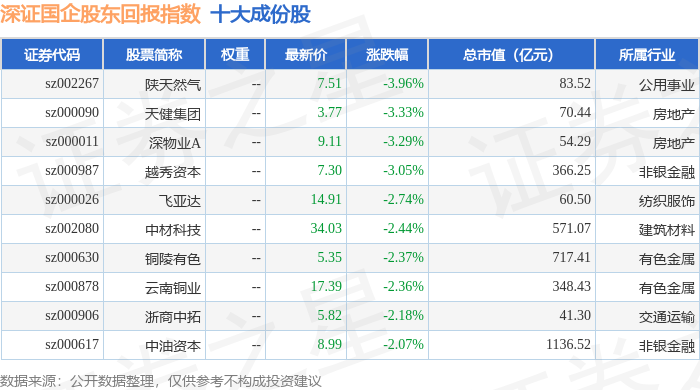 深证国企股东回报(970064)指数十大成份股详情如下: