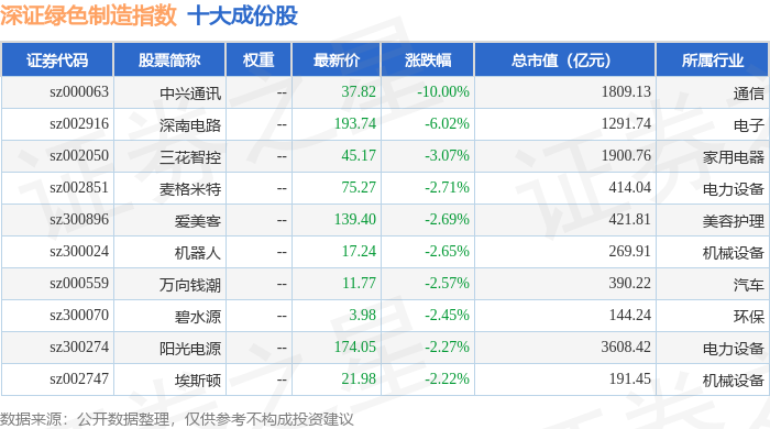 证券之星消息,12月11日,深证绿色制造(970069)指数报收于1862.9点,跌1.08%,成交1103.25亿元,换手率2.08%。当日该指数成份股中,上涨的有10家,金风科技以9.97%的涨幅领涨,下跌的有40家,中兴通讯以10.0%的跌幅领跌。