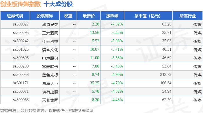 创业板传媒(970084)指数十大成份股详情如下:
