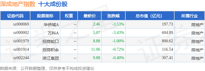证券之星消息,12月11日,深成地产(971001)指数报收于429.42点,跌2.12%,成交39.88亿元,换手率2.56%。当日该指数成份股中,下跌的有5家,华侨城A以3.53%的跌幅领跌。