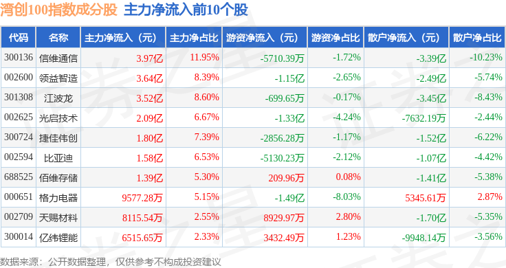 资金流向方面,湾创100(980001)指数成份股当日主力资金净流出合计112.06亿元,游资资金净流入合计27.62亿元,散户资金净流入合计84.44亿元。成份股资金流向详情见下表: