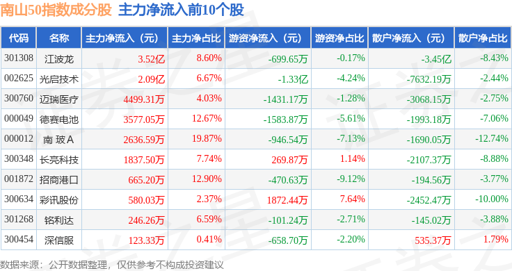 资金流向方面,南山50(980023)指数成份股当日主力资金净流出合计50.57亿元,游资资金净流入合计8.57亿元,散户资金净流入合计42.0亿元。成份股资金流向详情见下表: