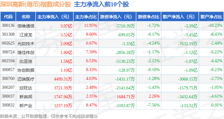 资金流向方面,深圳高新(港币)(980039)指数成份股当日主力资金净流出合计68.4亿元,游资资金净流入合计18.03亿元,散户资金净流入合计50.37亿元。成份股资金流向详情见下表: