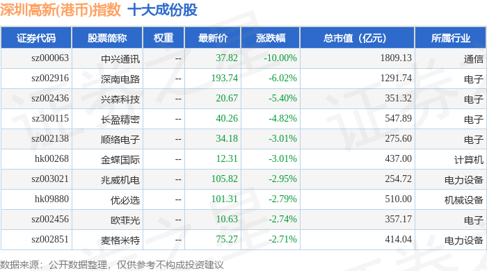 深圳高新(港币)(980039)指数十大成份股详情如下: