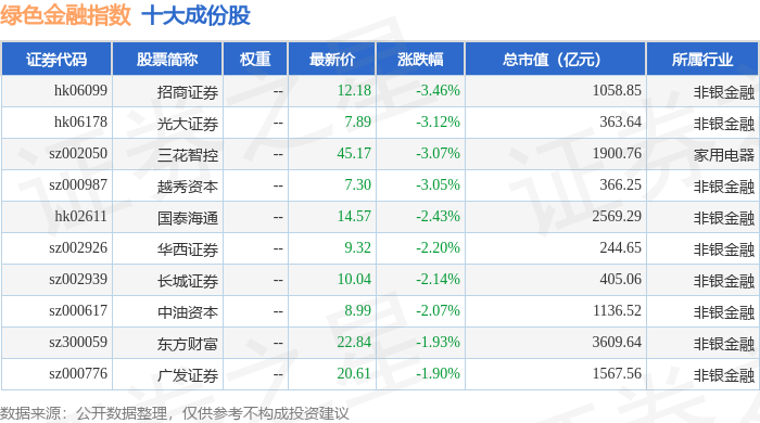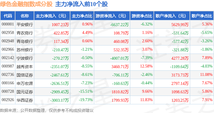 资金流向方面,绿色金融(980052)指数成份股当日主力资金净流出合计22.31亿元,游资资金净流入合计4.94亿元,散户资金净流入合计17.37亿元。成份股资金流向详情见下表: