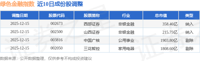 近10日内绿色金融(980052)指数成份股做了调整,新纳入了2只股票,剔除了2只股票。