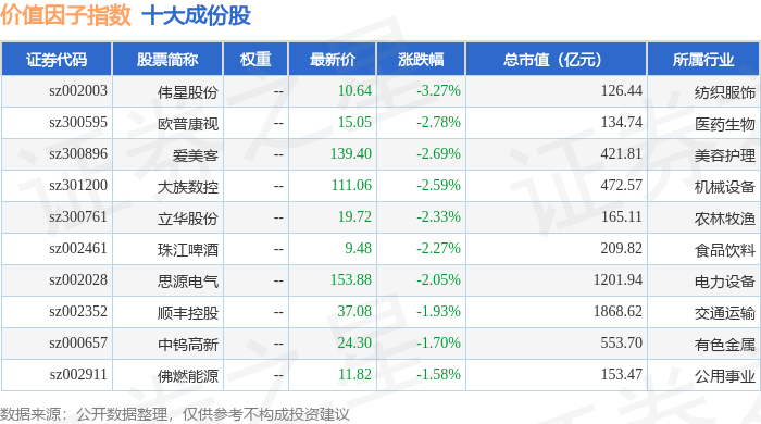 证券之星消息,12月11日,价值因子(980056)指数报收于2596.21点,跌0.45%,成交352.48亿元,换手率0.9%。当日该指数成份股中,上涨的有16家,藏格矿业以2.83%的涨幅领涨,下跌的有33家,伟星股份以3.27%的跌幅领跌。