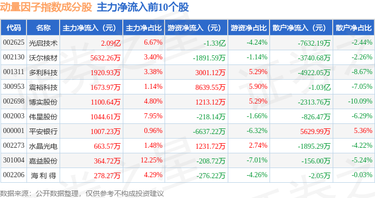 资金流向方面,动量因子(980057)指数成份股当日主力资金净流出合计19.8亿元,游资资金净流入合计2.2亿元,散户资金净流入合计17.6亿元。成份股资金流向详情见下表: