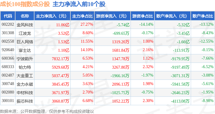 资金流向方面,成长100(980080)指数成份股当日主力资金净流出合计75.62亿元,游资资金净流入合计41.18亿元,散户资金净流入合计35.71亿元。成份股资金流向详情见下表: