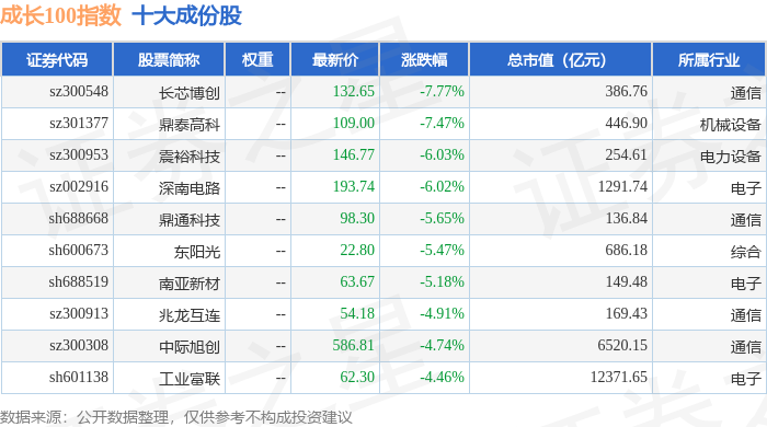 证券之星消息,12月11日,成长100(980080)指数报收于9507.02点,跌2.4%,成交1279.37亿元,换手率2.16%。当日该指数成份股中,上涨的有17家,富士达以13.42%的涨幅领涨,下跌的有83家,长芯博创以7.77%的跌幅领跌。