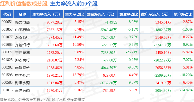 资金流向方面,红利价值(980103)指数成份股当日主力资金净流出合计11.38亿元,游资资金净流入合计1.77亿元,散户资金净流入合计9.61亿元。成份股资金流向详情见下表:
