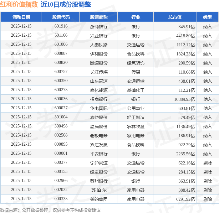 近10日内红利价值(980103)指数成份股做了调整,新纳入了15只股票,剔除了5只股票。