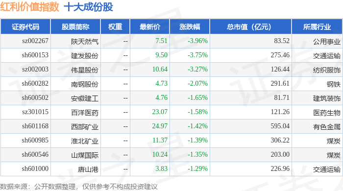 证券之星消息,12月11日,红利价值(980103)指数报收于3181.5点,跌0.39%,成交253.6亿元,换手率0.37%。当日该指数成份股中,上涨的有16家,江中药业以1.54%的涨幅领涨,下跌的有32家,陕天然气以3.96%的跌幅领跌。