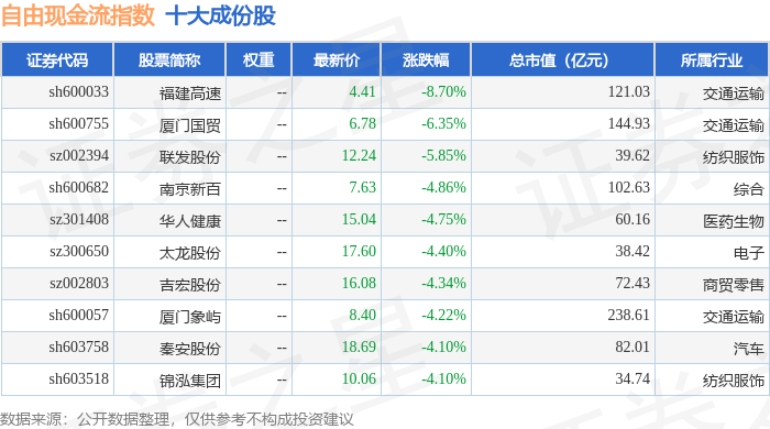 资金流向方面,自由现金流(980092)指数成份股当日主力资金净流出合计19.41亿元,游资资金净流入合计3.12亿元,散户资金净流入合计16.29亿元。成份股资金流向详情见下表: