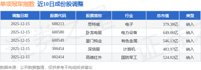 近10日内单项冠军(980150)指数成份股做了调整,新纳入了5只股票。