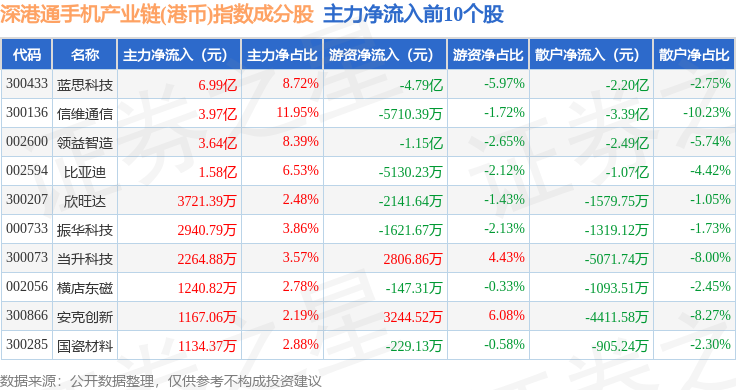 资金流向方面,深港通手机产业链(港币)(983010)指数成份股当日主力资金净流出合计65.78亿元,游资资金净流入合计13.86亿元,散户资金净流入合计51.93亿元。成份股资金流向详情见下表:
