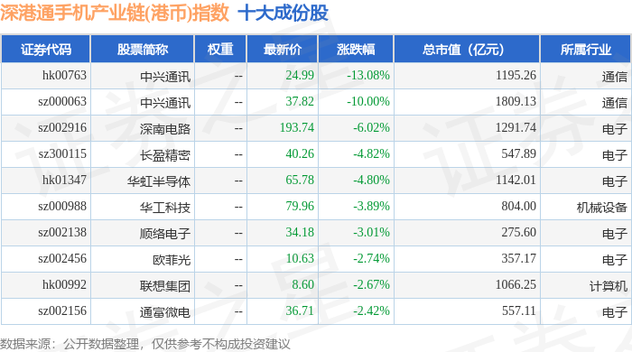 深港通手机产业链(港币)(983010)指数十大成份股详情如下: