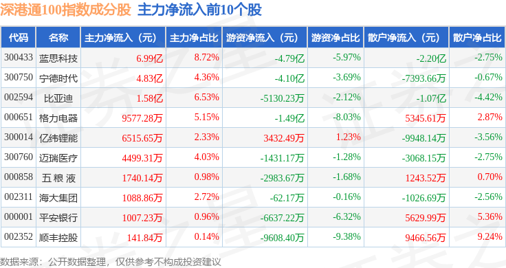 资金流向方面,深港通100(983007)指数成份股当日主力资金净流出合计118.25亿元,游资资金净流入合计43.34亿元,散户资金净流入合计74.92亿元。成份股资金流向详情见下表: