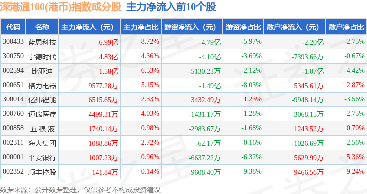 资金流向方面,深港通100(港币)(983008)指数成份股当日主力资金净流出合计118.25亿元,游资资金净流入合计43.34亿元,散户资金净流入合计74.92亿元。成份股资金流向详情见下表: